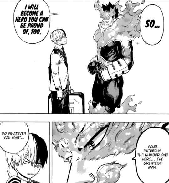The first big step we saw was in an episode of season 4 where Endeavor has come to watch the progress of Shoto’s remedial training to get his provisional hero’s license. However, All-Might is also there and you can feel the tension. All of Endeavor’s goals in life were driven by the need to surpass All-Might as the number one hero, and this need was the very thing that drove the abuse that Shoto was subjected to growing up. In the past Endeavor has shown only disdain for the former Number 1 hero, but in this moment we finally start to see the humanity in his character because even though Endeavor is now the number one hero, 1. It’s not on his terms, and 2. It’s not really taking. Instead of instigating a provocation with his hero rival, he instead asks for advice and asks All-Might what exactly is the symbol of Peace.