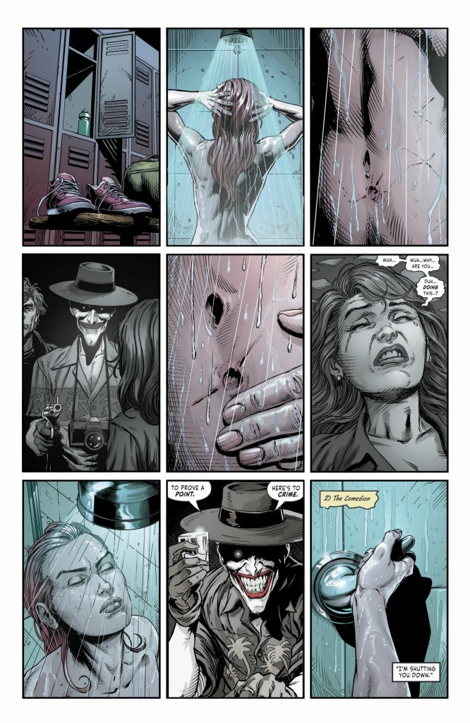 Elsewhere, Barbara Gordon is working out on a treadmill while a commerical for restless leg syndrome plays. The scene juxtaposes on her memory of being shot and paralyzed by the Joker. Ever since she had spinal surgery to regain use of her legs, Barbara has done her best to keep moving. To never let her legs go to waste, she would run, kick, and navigate without issue. As she goes to shower after breaking the treadmill, Barbara traces her bullet scars and can’t ever forget the face of Joker as he committed his horrible crimes.